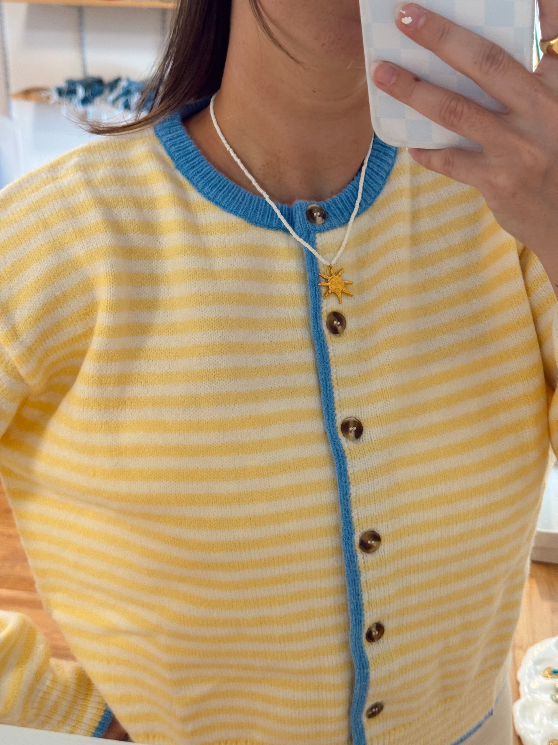 Soft, airy, and effortlessly put-together, the Butter Sky Cardigan blends creamy butter yellow, crisp white, and serene sky blue in a dreamy striped knit. Perfect for layering over your favorite summer or early fall looks, it’s the cardigan you’ll reach for again and again for that cozy, sun-kissed vibe.